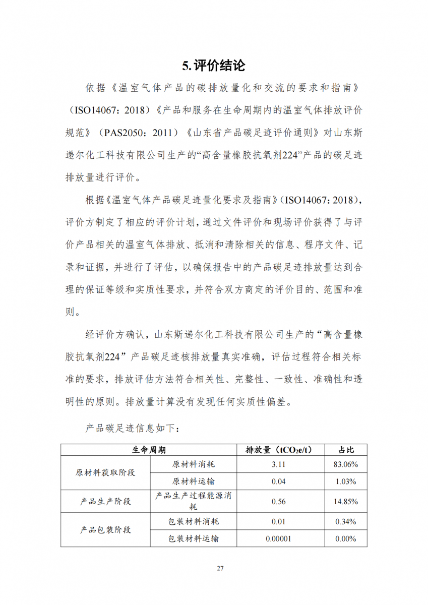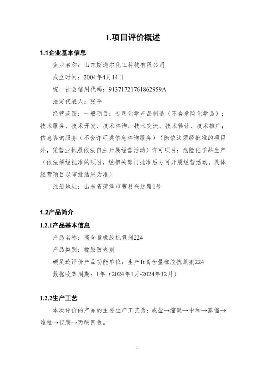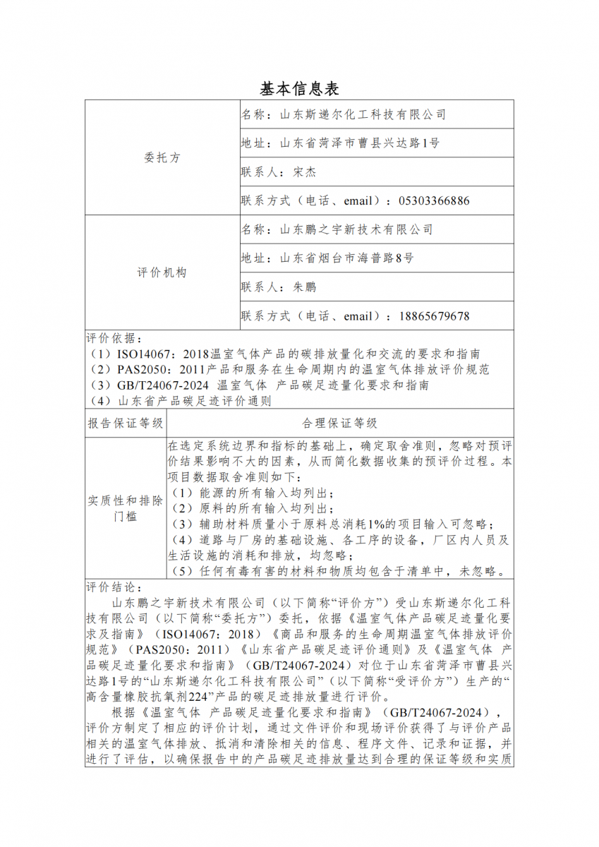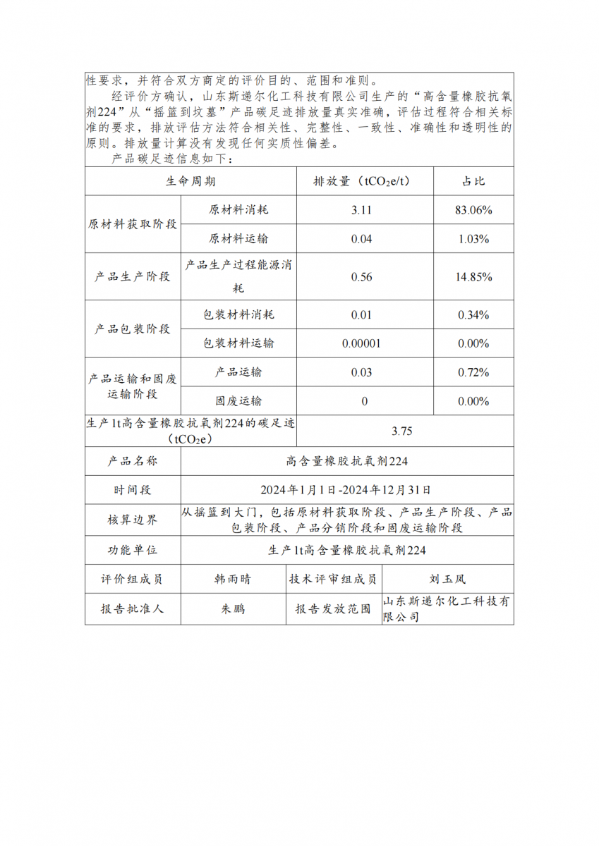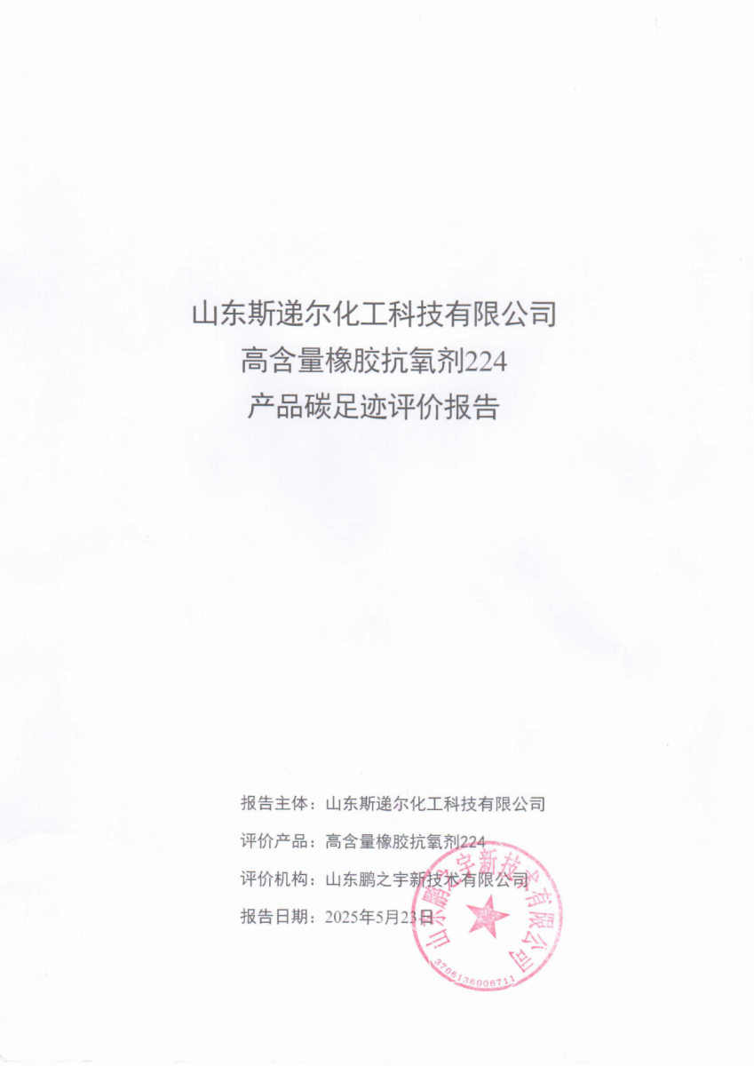 山東斯遞爾化工科技有限公司高含量橡膠抗氧劑224產(chǎn)品碳足跡評價(jià)報(bào)告