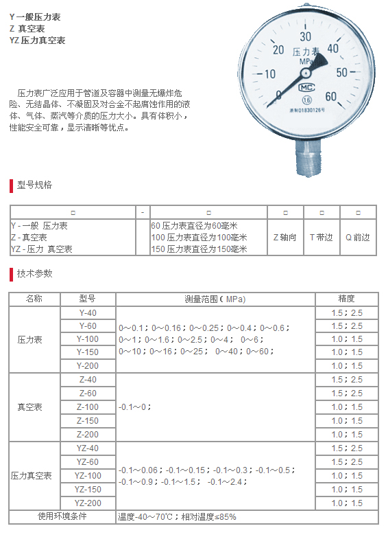 Y 一般壓力表 Z 真空表 YZ 壓力真空表 |