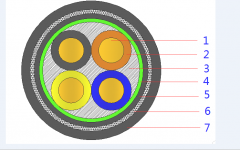 1-導(dǎo)體 2-絕緣 3-填充 4-繞包 5-內(nèi)護層 6-鋼帶鎧裝 7-護套 1-導(dǎo)體 2-絕緣 3-填充層 4-繞包層 5-銅帶屏蔽 6-護套